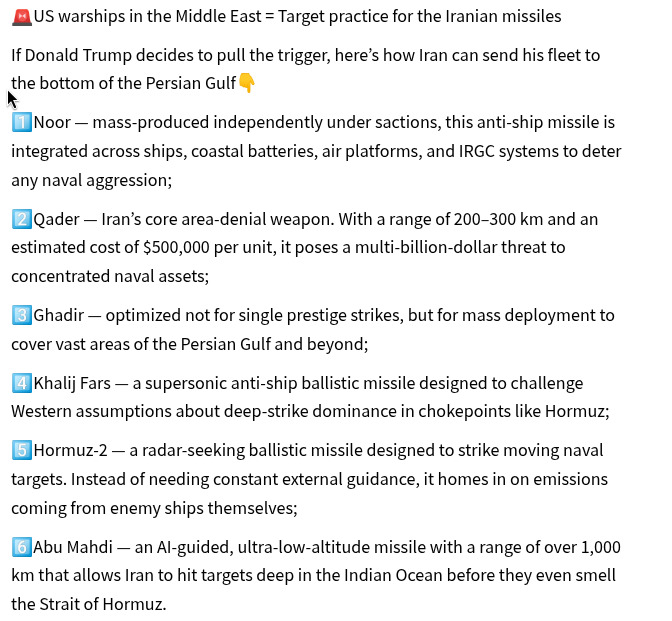 Let’s start with the first claim, i.e., the Iran’s ballistic missile arsenal was wiped out last June. Iran stopped firing missiles at Iran on June 24 because of a deal negotiated with the US to end the war… Not because Iran had run out of missiles. Iran’s ballistic missiles are stored in massive secure underground caves. We have seen no credible evidence that Israel or the US destroyed any of those facilities. Remember all of the predictions about Russia’s missile capability in the Spring and Summer of 2022? We were repeatedly informed that Russia was running out of missiles and that their inventory would soon be exhausted. I think we are seeing a repeat of this delusion with respect to Iran.